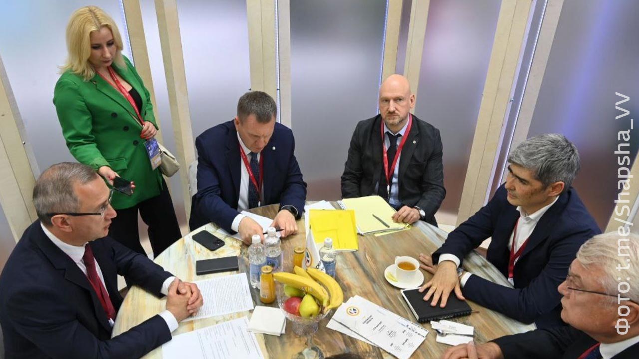 Губернатор Калужской области Владислав Шапша на полях Петербургского международного экономического форума встретился с президентом группы компаний "Калашников" Аланом Лушниковым.