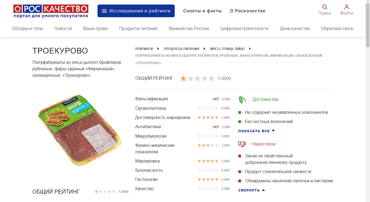 Как сообщает Роскачество, среди некачественных попались и полуфабрикаты из мяса цыплят-бройлеров рубленые, фарш куриный «Фирменный» охлажденный, под торговой маркой «Троекурово», произведенные АО «ПРОДО птицефабрика Калужская». Образец, приобретенный в московском «Ашане», получил лишь 1 звезду качества из 5. В фарше обнаружили кишечную палочку и листерии.