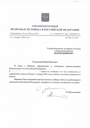Калужский Уполномоченный принял участие в судьбе калужан, приложив все силы к их освобождению. Оценив проделанную работу, Уполномоченный по правам человека в Российской Федерации Татьяна Москалькова выразила Юрию Зельникову искреннюю признательность за заботу о судьбе каждого гражданина Российской Федерации, попавшего в сложную жизненную ситуацию.