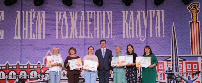 Затем на Театральной площади стартовали праздничные гуляния. Руководители города поздравили калужан и пожелали успехов в труде на благо родного города. Были награждены победители конкурса «Дом образцового содержания»