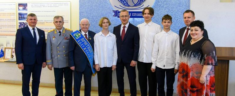 Мероприятие завершилось общим фото с почетным гражданином Калужской области Валерием Михалёвым на фоне эмблемы завода «Кировская керамика».