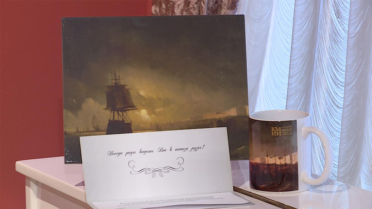 На кружке и керамической плитке — картина Ивана Айвазовского "Вид Одессы в лунную ночь". Екатерина Соловьева распаковывает подарки. Главный в числе других — годовой абонемент на два лица.