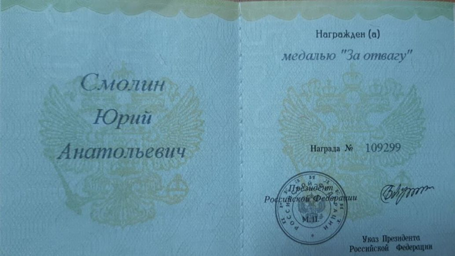 Сейчас пришло известие, что Смолин награжден медалью «За отвагу» - это самая почитаемая медаль, которую вручают за личное мужество и храбрость. Торжественно вручать медаль Юрию Смолину будут в администрации Обнинска.