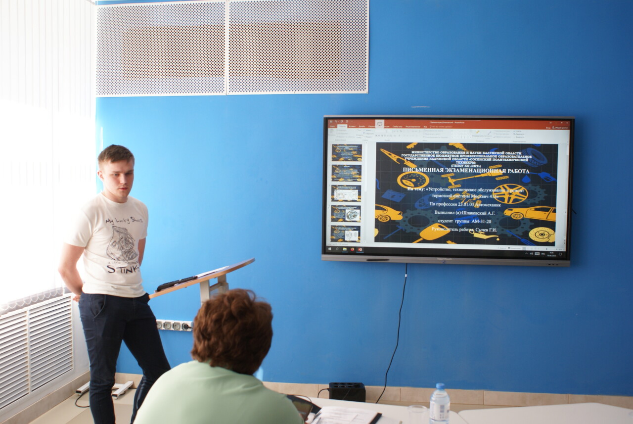 Один из них – Артем Шпаковский. Он защищает материал на тему «Устройство, техническое обслуживание и ремонт тормозной системы легкового автомобиля». На интерактивном экране – слайды с презентацией материала.