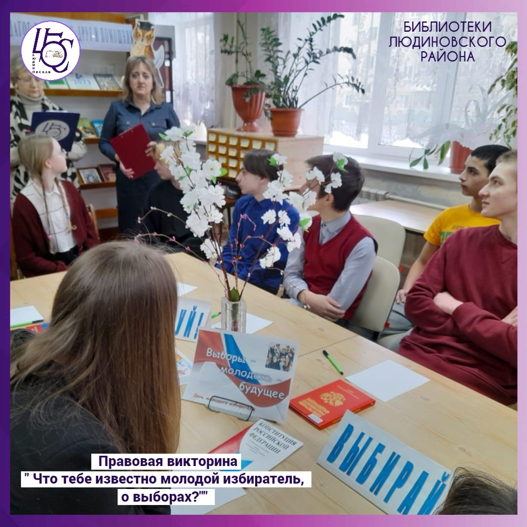 14 февраля в Городской библиотеке №1 (Сукремль) для старших школьников МКОУ СОШ №4, преподаватель Молоткова С.С. прошла правовая викторина «Что тебе известно, молодой избиратель,о выборах?»