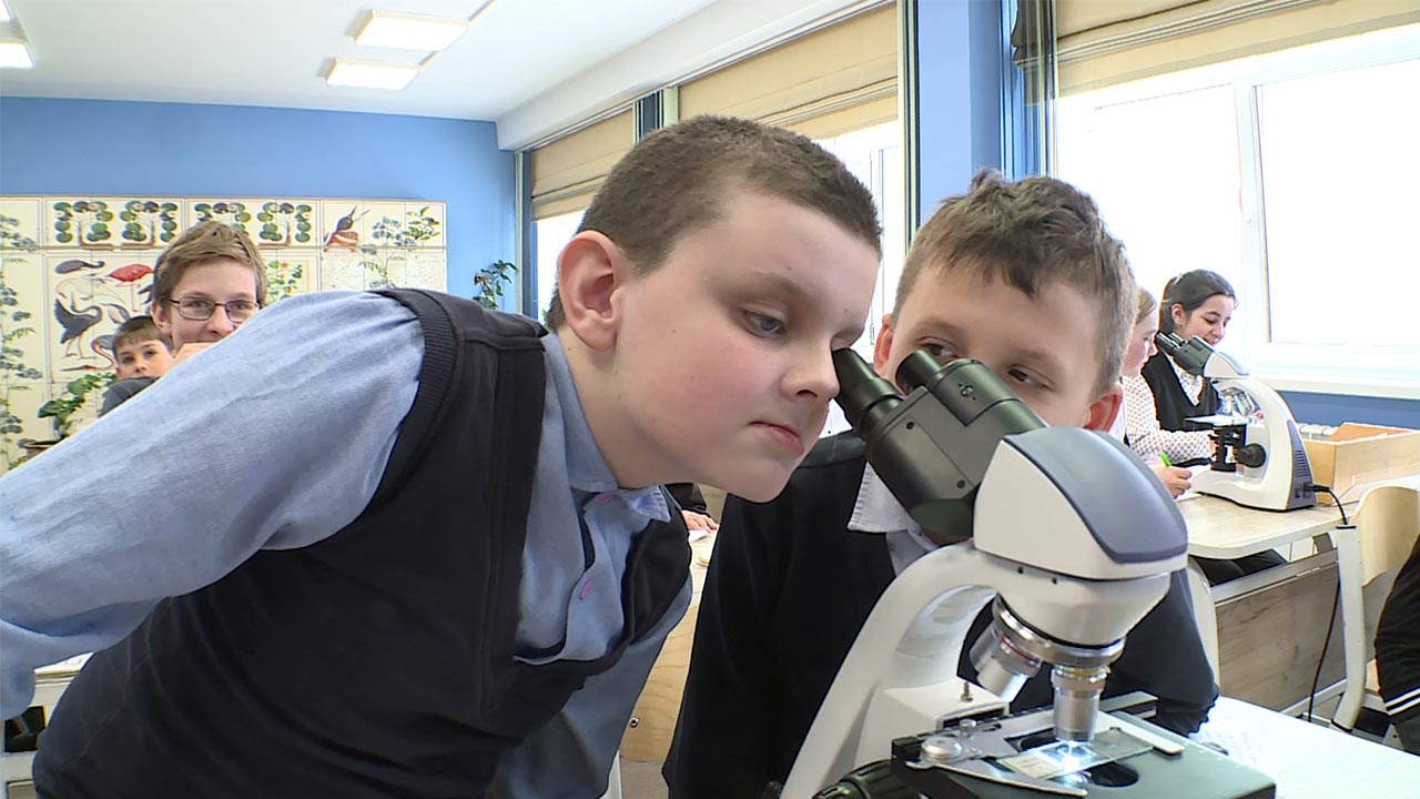 Пятиклассники демонстрируют возможности новейших микроскопов. Теперь не нужно напрягать глаза, чтобы увидеть, например, цилиндрические клетки водоросли спирогиры. Продуманное оформление, учебные пособия, мультимедийные средства и дополнительное оборудование, которое в школе появилось не так давно, — все это сделало кабинет биологии одним из любимых мест учеников. Интерес к научной деятельности возрос в разы. В том числе благодаря современным лабораториям. Как итог — перемышляне стали победителями и призерами областных и всероссийских конкурсов.