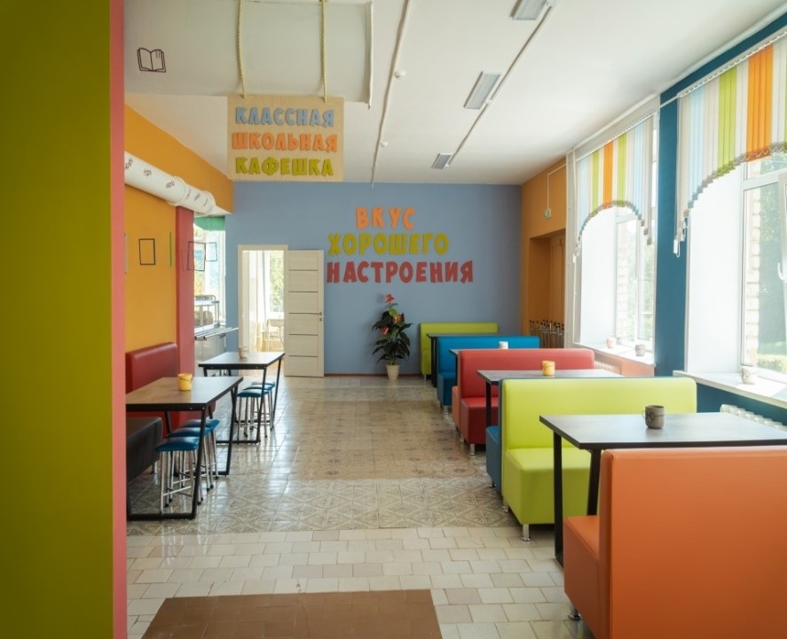 В итоге привычная школьная столовая превратилась в уютную молодежную кафешку. Здесь не только были покрашены стены и потолок, заменена мебель и кухонное и сантехническое оборудование, но и отремонтирована система освещения.