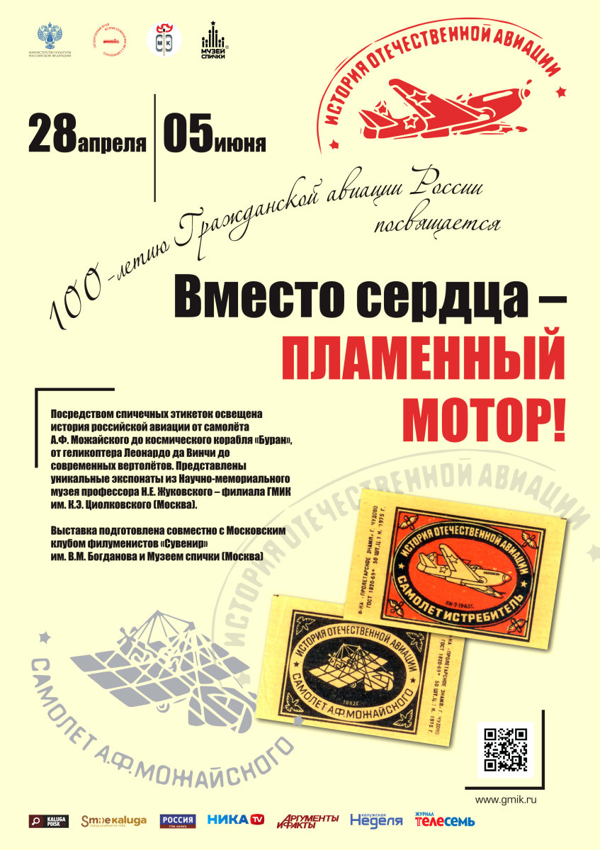 29 апреля 2023 года в Государственном музее истории космонавтики имени К.Э. Циолковского начинает работу выставка спичечных этикеток, посвящённая 100-летию российской авиации. Это совместный проект ГМИК имени К.Э. Циолковского и московских филуменистов.