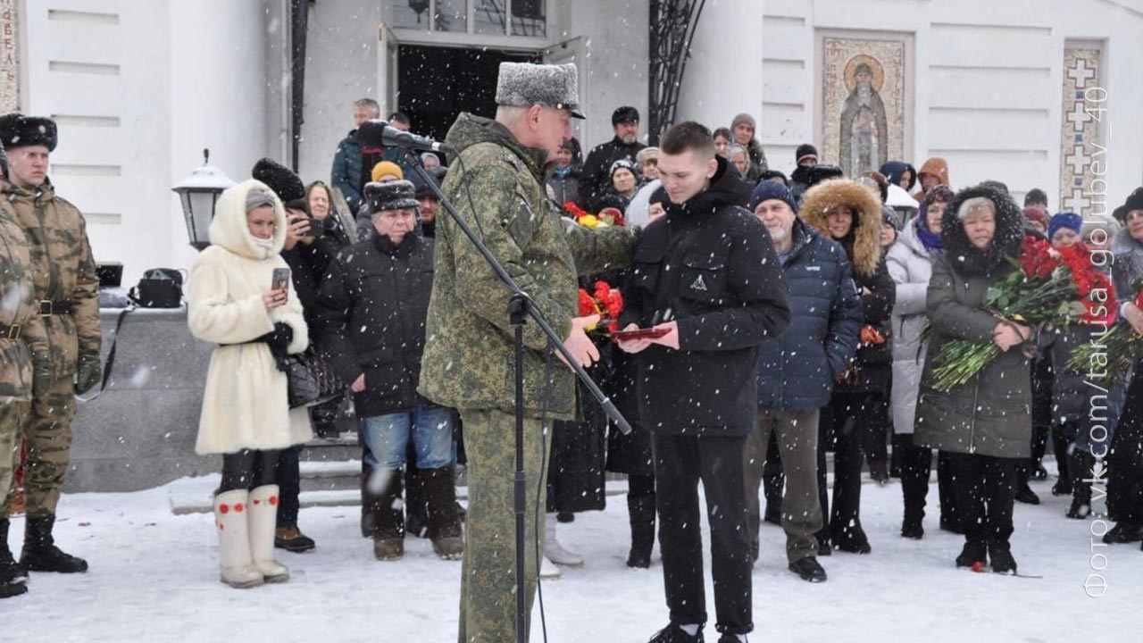 Военный комиссар Калужской области Сергей Кузьменков передал орден сыну Александра Демкина.