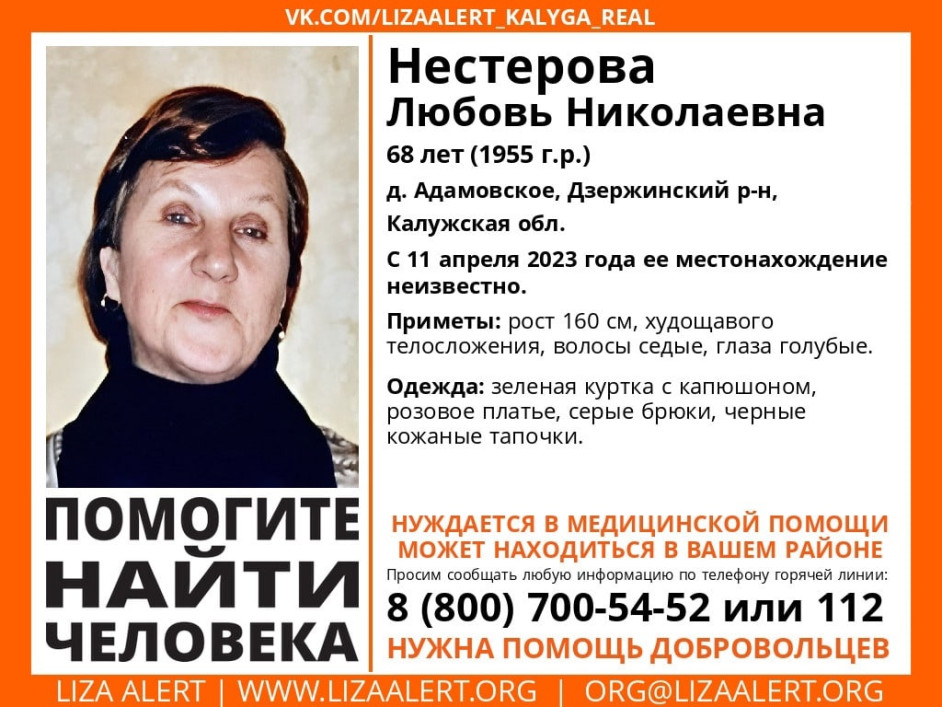В деревне Адамовское Дзержинского района Калужской области пропала 68-летняя пенсионерка. По данным поискового отряда «ЛизаАлерт» Калужской области, местонахождение пропавшей неизвестно с 11 апреля 2023 года.