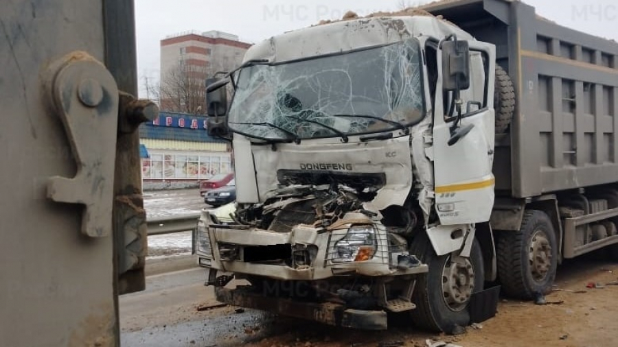 Сегодня днем на улице Мирной в Белоусове случилась серьезная авария. По предварительным данным, водитель самосвала «Донг Фенг» перед светофором врезался в другой грузовик «Шакман».