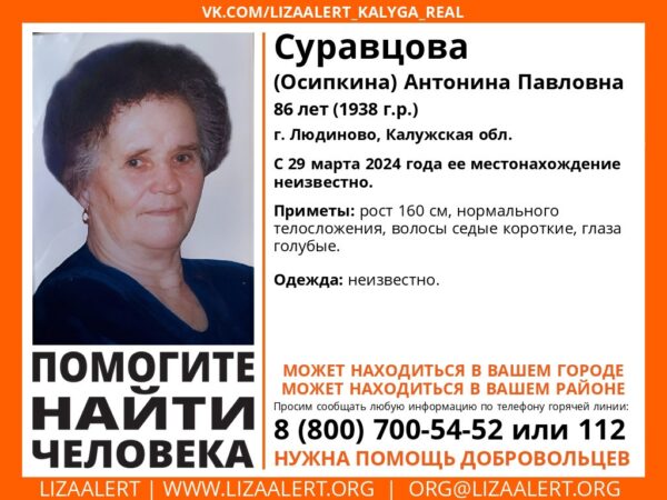 В Людиновском районе пропала 86-летняя местная жительница Антонина Суравцова (Осипкина), сообщил отряд «ЛизаАлерт».