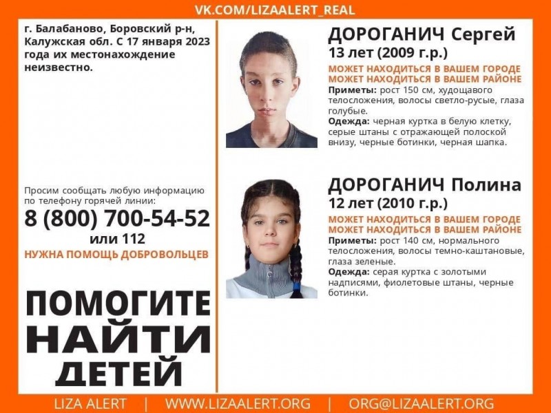 Сегодня поисковый отряд «Лиза Алерт» сообщил информацию о том, то в Балабанове с 17-го января ведутся поиски двух детей.