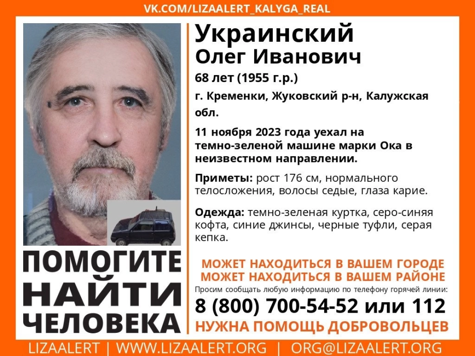Поисково-спасательный отряд «Лиза Алерт» объявил о поисках 68-летнего Украинского Олега Ивановича.