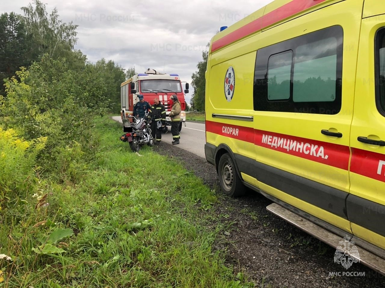 По предварительным данным, байкер на «Кавасаки» не справился с управлением, съехал в кювет и перевернулся.