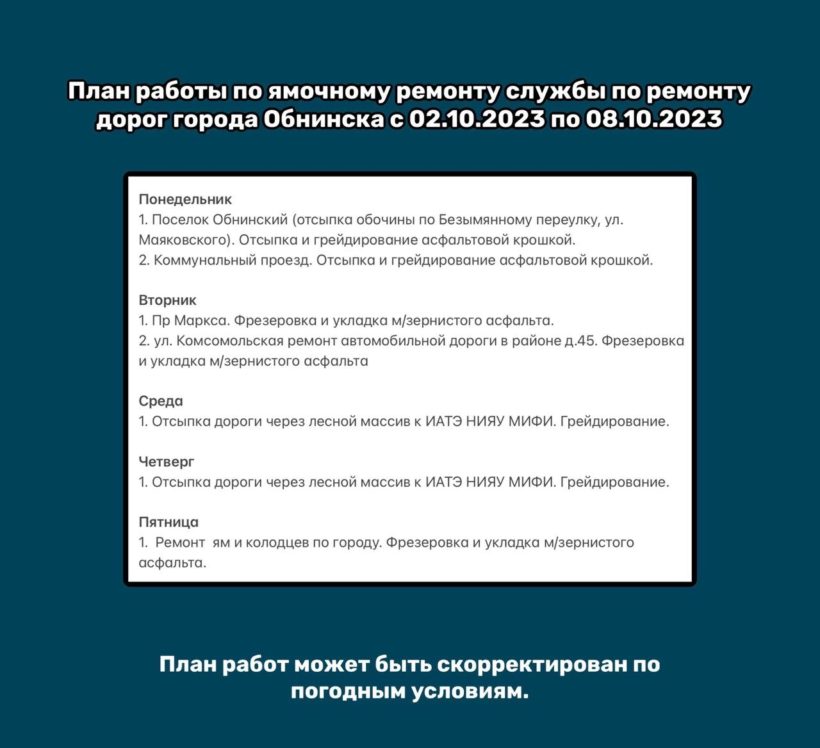 Среду и четверг внимание коммунальных служб будет целиком и полностью посвящено дороге через лесной массив к ИАТЭ НИЯУ МИФИ. Город обещает привести её в порядок, сделав отсыпку и грейдирование.