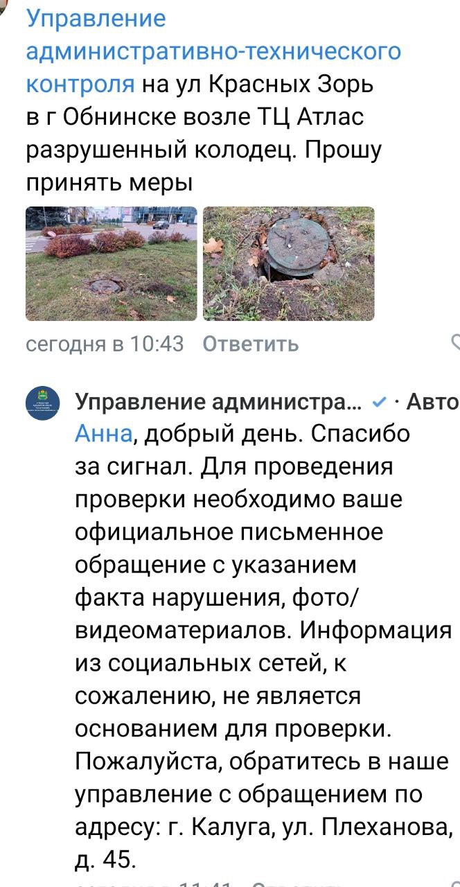 Вчера жители Обнинска обратились в Управление административно-технического контроля Калужской области на официальной странице ведомства с просьбой принять меры по факту разрушенного колодца в общедоступном месте.