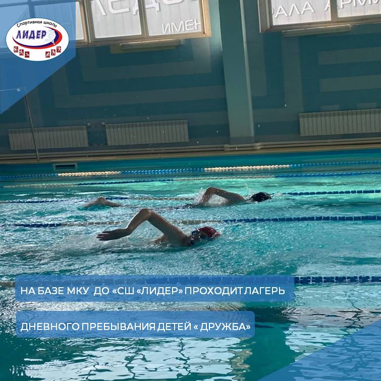 На базе МКУ ДО «СШ «Лидер» идет лагерь дневного пребывания детей «Дружба» . Воспитанники отделения «Плавание» активно проходят лагерную смену. В их распорядке дня присутствуют не только общелагерные мероприятия , но и тренировочный процесс, не только в воде , но и на суше.