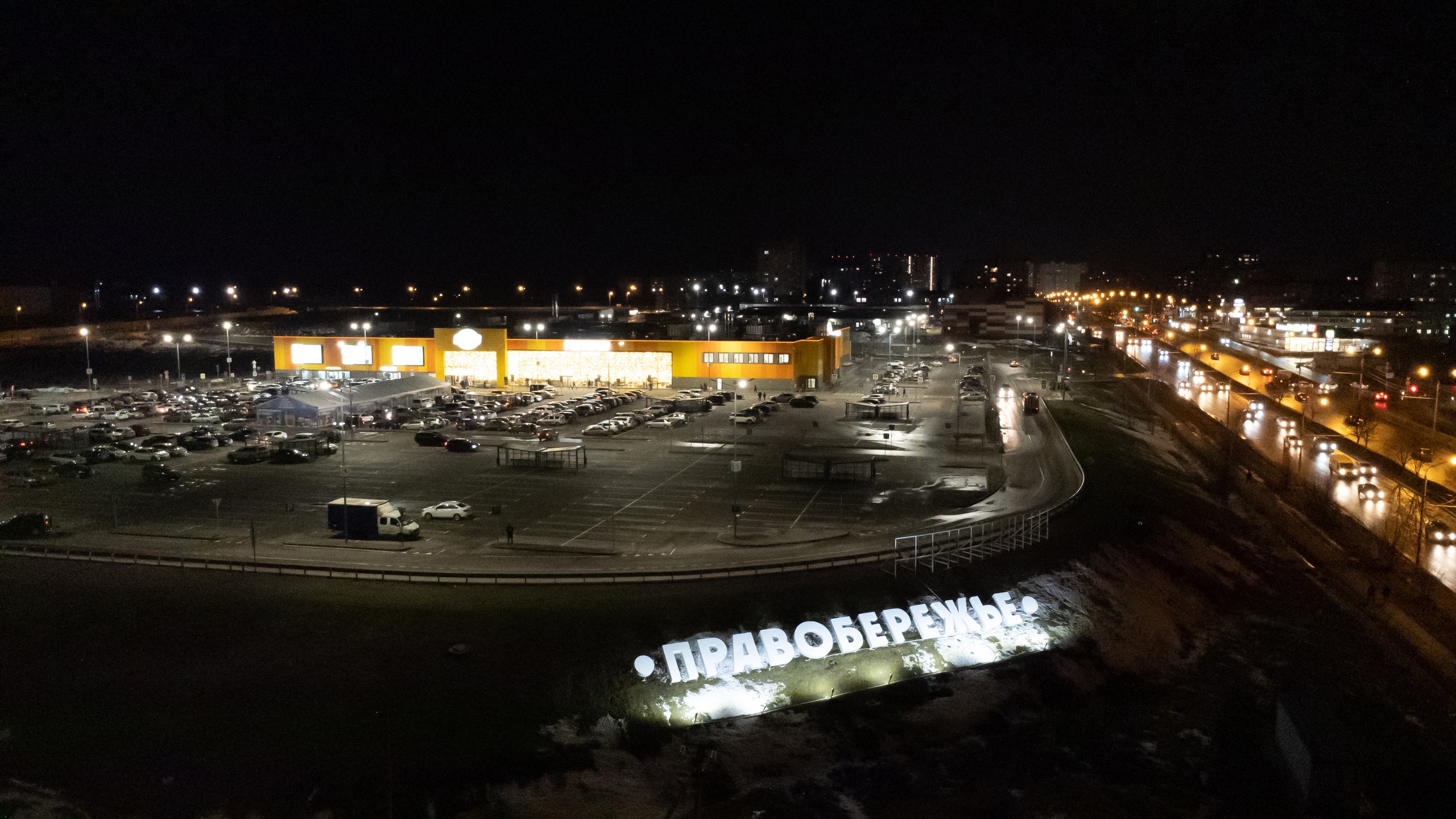 Объемные буквы высотой 2,4 метра и общей длинной более 30 метров эффектно подсвечены в темное время суток. В дневное время легко читаются с большого расстояния и привлекают внимание на въезде в Правобережье.