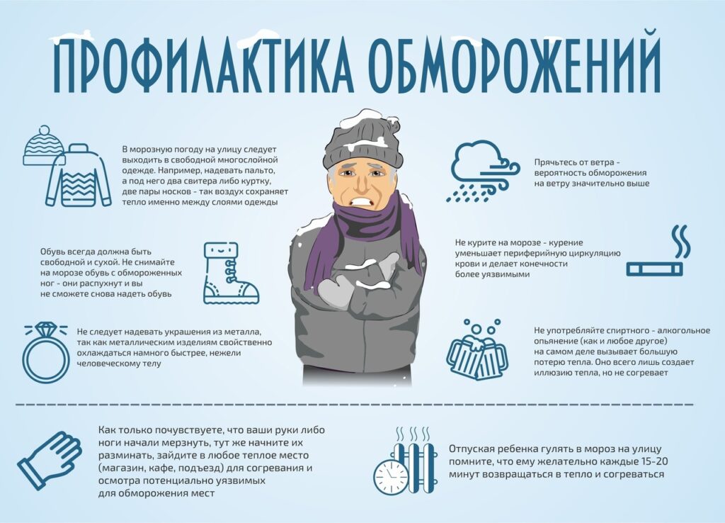 Долгое пребывание на улице в морозную погоду может привести к переохлаждению организма. От обморожения чаще всего страдают щёки, нос, уши, подбородок, пальцы рук и ног.