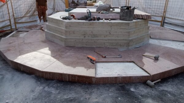 По его словам, сейчас рабочие облицовывают гранитом постамент и нижние уступы. С этой недели начнут появляться цельные каменные элементы и бронзовые детали стелы. Комов обратил внимание на то, как подрядчик тщательно соблюдает требования проекта.