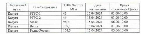 Будут отключены передающие средства филиала РТРС "Калужский ОРТПЦ" , задействованные в эфирной трансляции пакетов программ «РТРС-1» и «РТРС-2» в цифровом формате и радиопрограмм аналогового вещания.