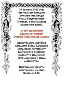 Дорогие друзья! Приглашаем Вас принять молитвенное участие в престольном торжестве мужского монастыря Спаса Нерукотворного пустынь в селе Клыково Козельского района Калужской области 29 августа сего года. Божественную литургию возглавит Глава Калужской митрополии митрополит Калужский и Боровский Климент в сослужении пяти архиереев и сонма духовенства. Начало богослужения в 9. 00.