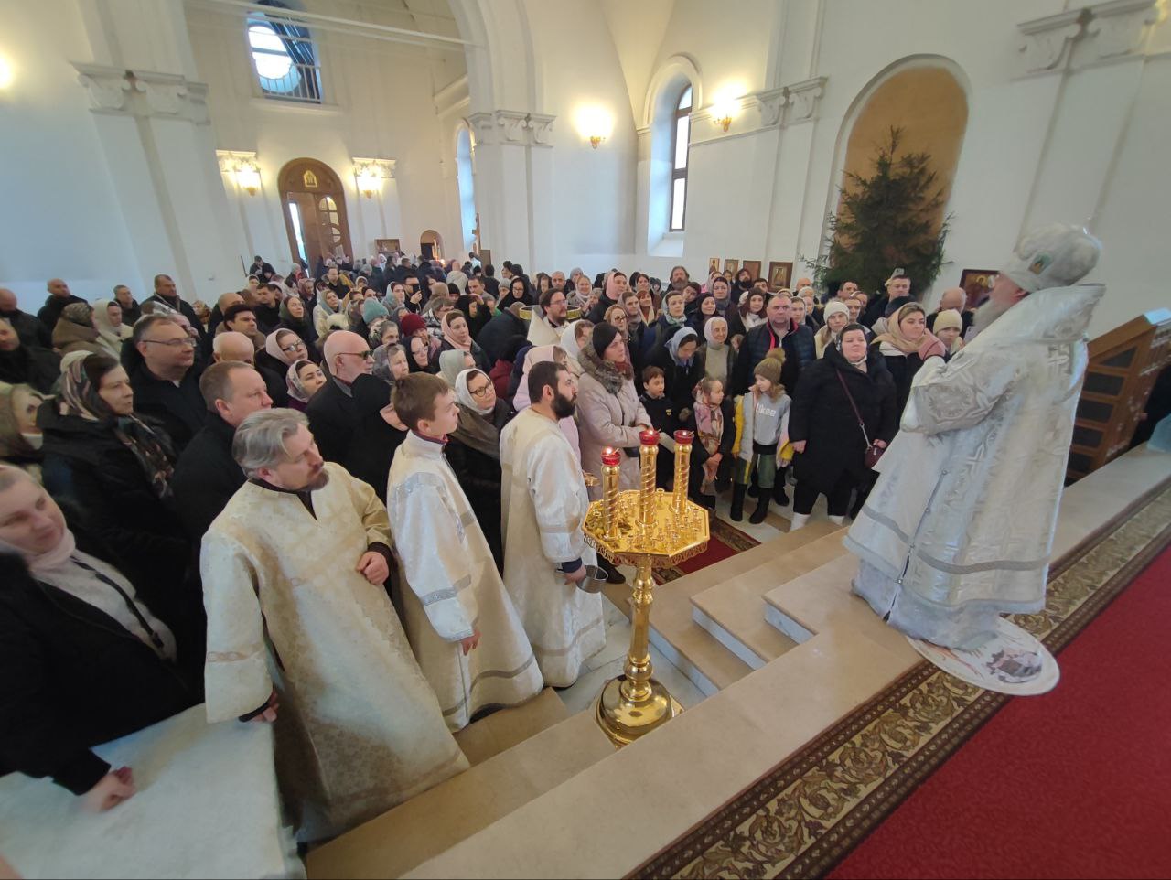 После заамвонной молитвы священнослужители совершили чинопоследование великого освящения воды, а затем владыка обратился к богомольцам с проповедью.