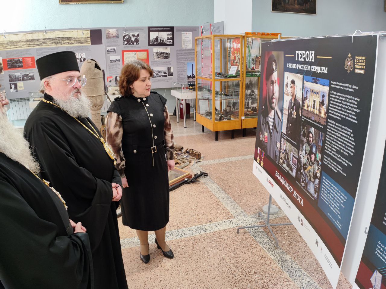 Владыка и священнослужители, осмотрев Пасхальную выставку, познакомились с другими оформленными экспозициями, на втором этаже музея, в актовом зале: с выставкой авторских работ из керамики «Герои с чисто русским сердцем» Ольги Балакиной и выставкой картин Натальи Пугачёвой «Женщины в истории России».
