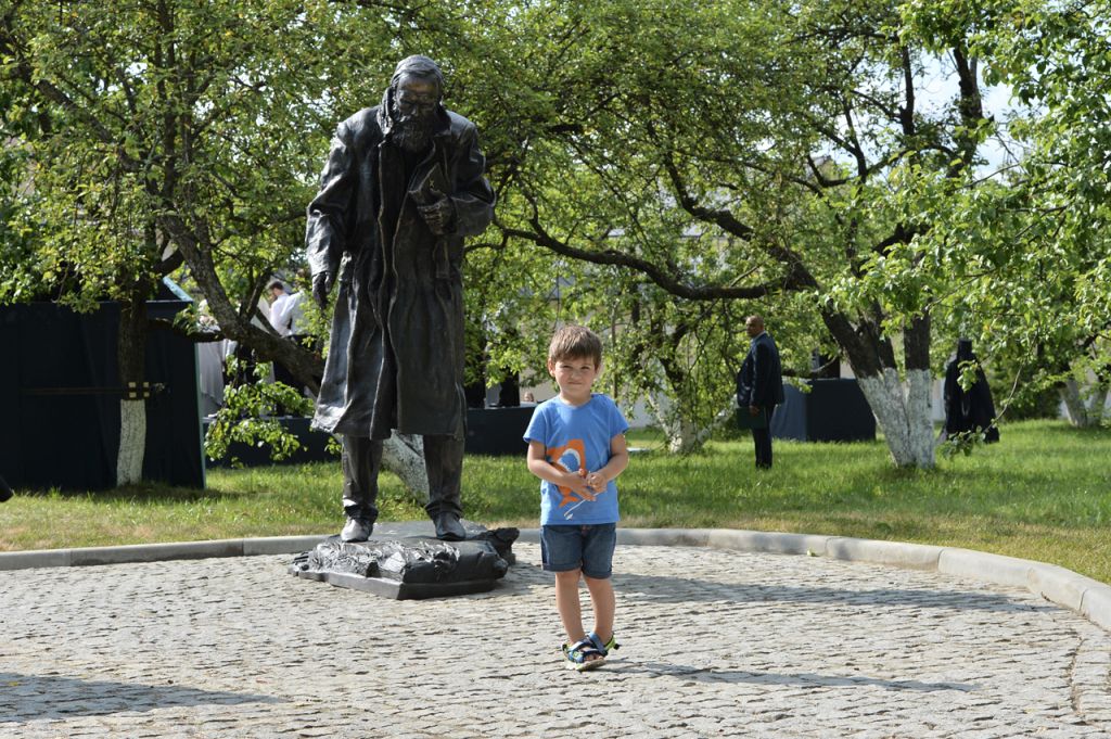 Затем зазвучала торжественная музыка, и владыка Иосиф в сопровождении почетных гостей снял покрывало с монумента, после чего начался молебен преподобным старцам Оптинским, во время которого памятник был освящен.