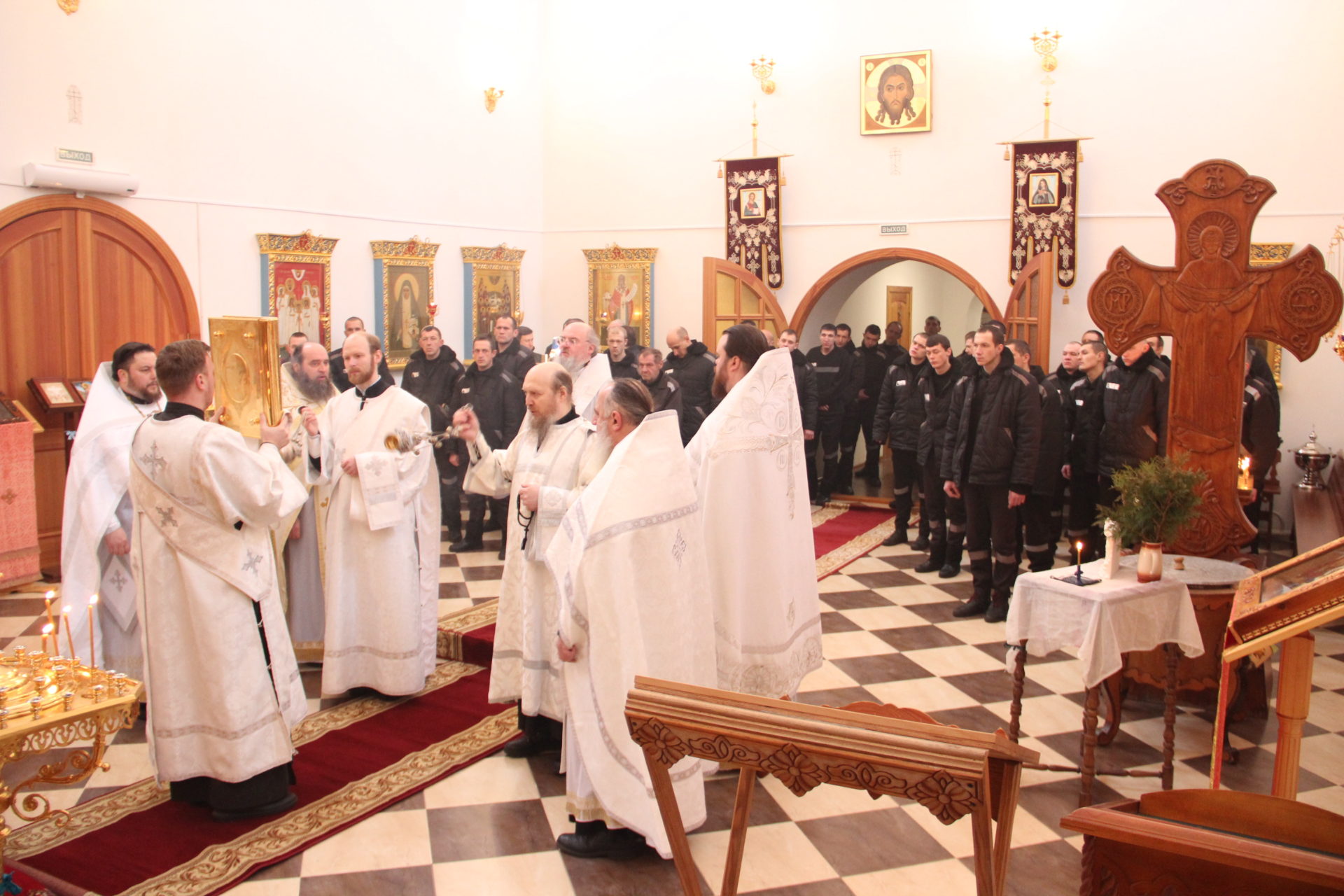 Архипастырю сослужили: протоиерей Дмитрий Сахаров – глава отдела по работе с исправительными учреждениями Козельской епархии, протоиерей Сергий Сычев, протоиерей Антоний Хатунцев, иерей Вадим Ваньков, диакон Евгений Васильев и иеродиакон Лука (Старостин), а также иеромонах Силуан – насельник монастыря Оптина Пустынь, окормляющий осужденных.