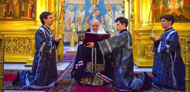 По традиции после входа с кадилом и пения великого прокимна, духовенство переоблачилось в темные одежды, а песнопения стали исполняться великопостным чином.
