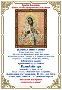 По благословению митрополита Калужского и Боровского Климента в Калужской митрополии с 28 июня по 31 июля 2023 года совершается ежегодный Крестный ход «Помолимся о земле Калужской» с чудотворной Калужской иконой Божией Матери,