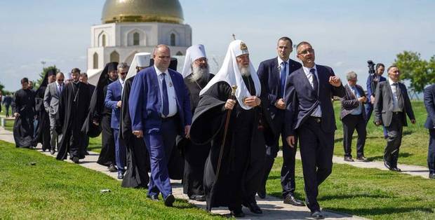 Святейший Патриарх Кирилл побывал у живописного места слияния Волги и Камы и посетил памятный знак «Принятие ислама» (Музей Корана), который находится в начале маршрута по древнему городищу.
