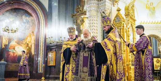 После великого славословия Предстоятель Русской Православной Церкви совершил чин выноса Креста.