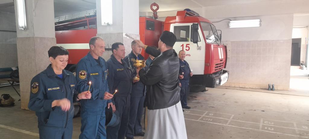 Молебен в пожарной части района прошел по случаю праздника иконы Божьей Матери «Неопалимая Купина» и в день воспоминания чуда Архистратига Михаила (Михайлов день).