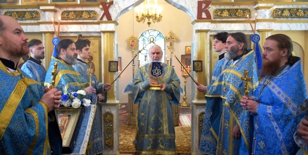 По окончании богослужения было совершено славление святителю Тихону патриарху Московскому и всея России и Благовещения Пресвятой Богородицы.