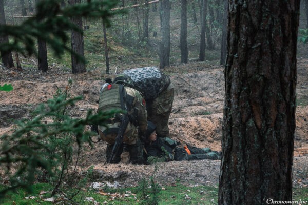 В лесу несколько две группы вытаскивали раненного. После этого готовились носилки и под прикрытием уходили в безопасную зону.