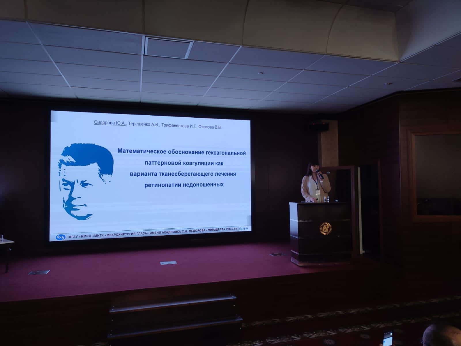 Калужский филиал МНТК представила заведующая отделением лазерной хирургии донной патологии глаза, к.м.н. Сидорова Юлия Александровна. В докладе «Математическое обоснование гексагональной паттерновой коагуляции как варианта тканесберегающего лечения ретинопатии недоношенных» были описаны исторические этапы использования различных лазерных технологий в лечении тяжелого заболевания недоношенных детей – ретинопатии недоношенных, применяемые в КФ МНТК с 2009 года. На сегодняшний день накопленный практический опыт и современные технологические достижения позволили предложить оптимальную технику нанесения лазерного аппликата на сетчатку, которая позволяет получить прогнозируемый клинический ответ с минимальной энергетической нагрузкой, а также может быть использовано при проведении транспуппилярной лазерной коагуляции другой сосудистой патологии. Представленное масштабное и глубокое осмысление заявленного вопроса было высоко оценено собравшимися специалистами, а доклад был удостоен Приза зрительских симпатий.