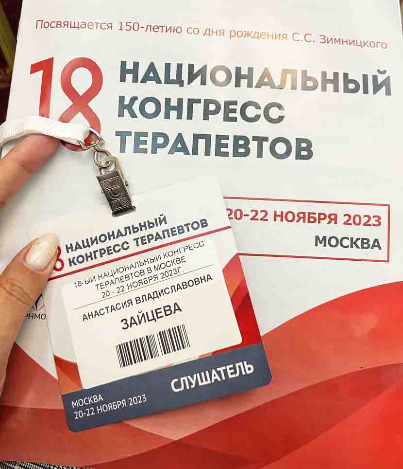 20-22 ноября 2023 года Заведующий консультативно-диагностическим отделением нашего Центра, Зайцева Анастасия Владиславовна, приняла участие в 18 Национальном конгрессе терапевтов – главном мероприятии Российского научного медицинского общества терапевтов.