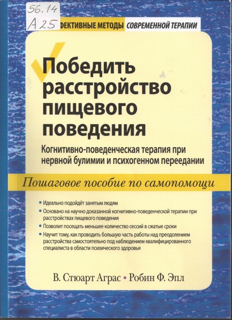 Аграс, В. Стюарт. Победить расстройство пищевого поведения : когнитивно-поведенческая терапия при нервной булимии и психогенном переедании : пошаговое пособие по самопомощи / В. Стюарт Аграс, Робин Ф. Эпл ; [перевод с английского и редакция М. Д. Насими]. — Москва ; Санкт-Петербург : Диалектика, 2021. — 128 с. : ил ; 24 см. — (Эффективные методы современной терапии). — Вар. загл. : Когнитивно-поведенческая терапия при нервной булимии и психогенном переедании. — 300 экз. — ISBN 978-5-907365-20-9.