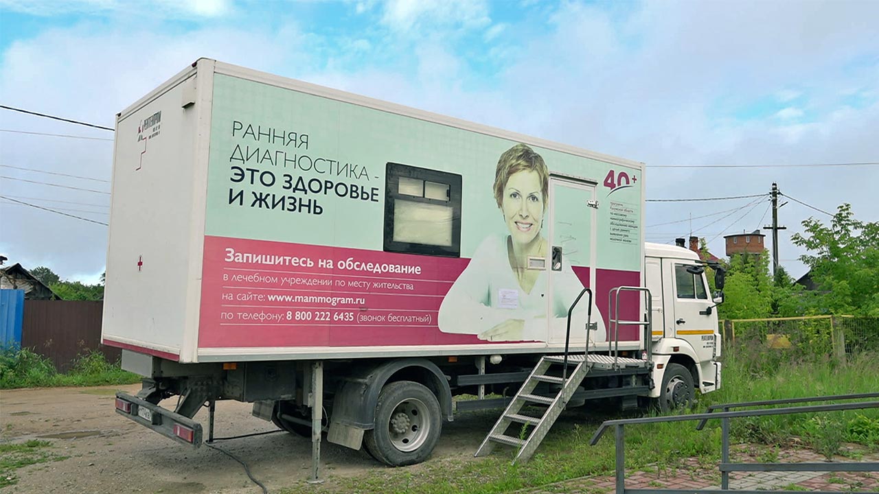 Передвижной маммограф работает по графику в разных населенных пунктах. Записаться на обследование можно в медицинском учреждение по месту жительства, а также по бесплатному номеру 8-800-222-64-35 или на сайте mammogrum.ru.