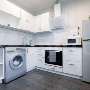 Оборудованная кухня: кухонный гарнитур, холодильник, СВЧ-печь, варочная панель, электрочайник, два стула, стол, вся необходимая посуда.