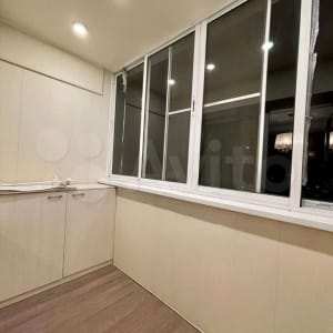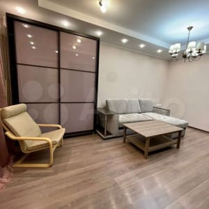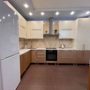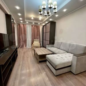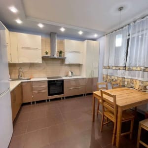 В зале удобный диван, журнальный столик напротив тв тумба с телевизором, большой шкаф для одежды, выход на первую лоджию и вход в кухню. В кухне современный гарнитур, стол с комплектом стульев и необходимая бытовая техника.
